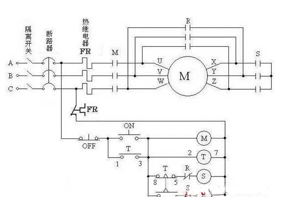 R接觸器,為啟動之后,把電機繞組首尾連接起來。即U-Z,Y-W,X-V三個繞組的三角形接法。 T時間繼電器,起動時,比如要讓電機在5秒內完成起動進入正常運轉狀態(tài),就可把時間繼電器設定到5秒